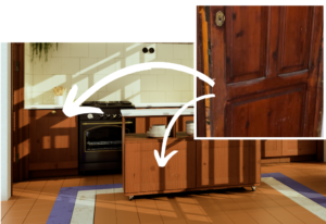 In this case the furniture and carpentry were made of chipboard with railite laminate. We are going to make the carpentry following the same design criteria as the windows and doors, imitating the colour, material and style of the pantry door to make it look as if it had always been like this. As far as the handles are concerned, it was decided to use very simple brass-coloured ones like the original handles on the patio and pantry doors.