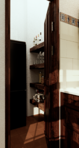 The owners were clear about their choice of appliances. Although in general appearance they had to look as antique as possible, in terms of functionality they had to adapt to the times we live in. The cooker and oven work with gas because they love this type of cooking and an imitation antique model has been chosen to fit in with the style in black so that it goes as unnoticed as possible among the kitchen woodwork. A dishwasher will be placed on the right-hand side of the sink and will be integrated with the same carpentry as the rest for the same reason to «make it disappear» so that it does not take centre stage. The big dilemma was the location of the fridge, as wherever we put it in the kitchen it «bothered» both aesthetically and detracted from its functionality as it took away from the preparation area. It was decided to place it in the old pantry as there was plenty of space. In the rest of the pantry, open shelves were placed for different storage. Remember that the fridge gives off heat, so a window will be placed above the pantry door as a vent.